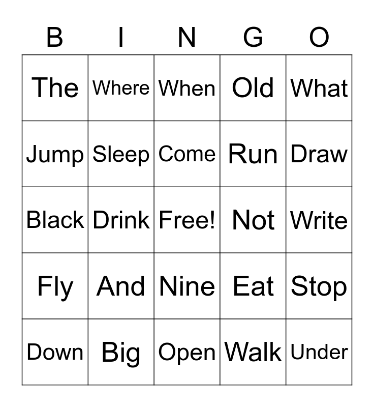 This bingo card has a free space and 24 words: And, Big, Come, Down, What, The, Jump, Where, Not, Nine, Run, Black, Eat, Stop, Sleep, Walk, Write, When, Draw, Drink, Under, Fly, Old and Open.