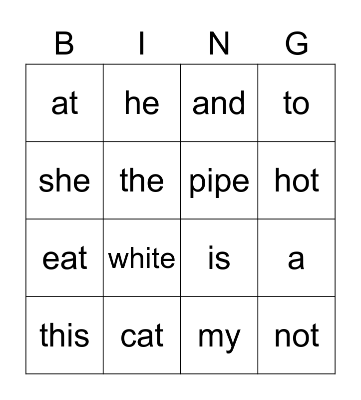 This bingo card has 16 words: cat, a, and, at, eat, he, is, my, she, the, this, to, white, hot, pipe and not.