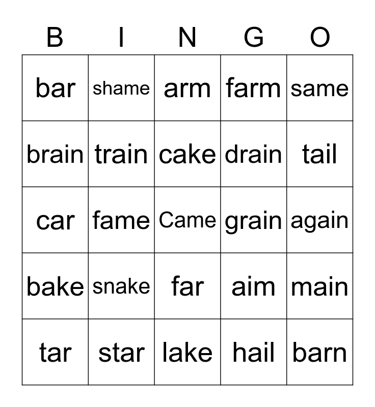 This bingo card has a free space and 24 words: snake, star, cake, tar, same, bar, brain, shame, grain, far, drain, car, aim, main, train, hail, again, arm, tail, fame, barn, bake, farm and lake.