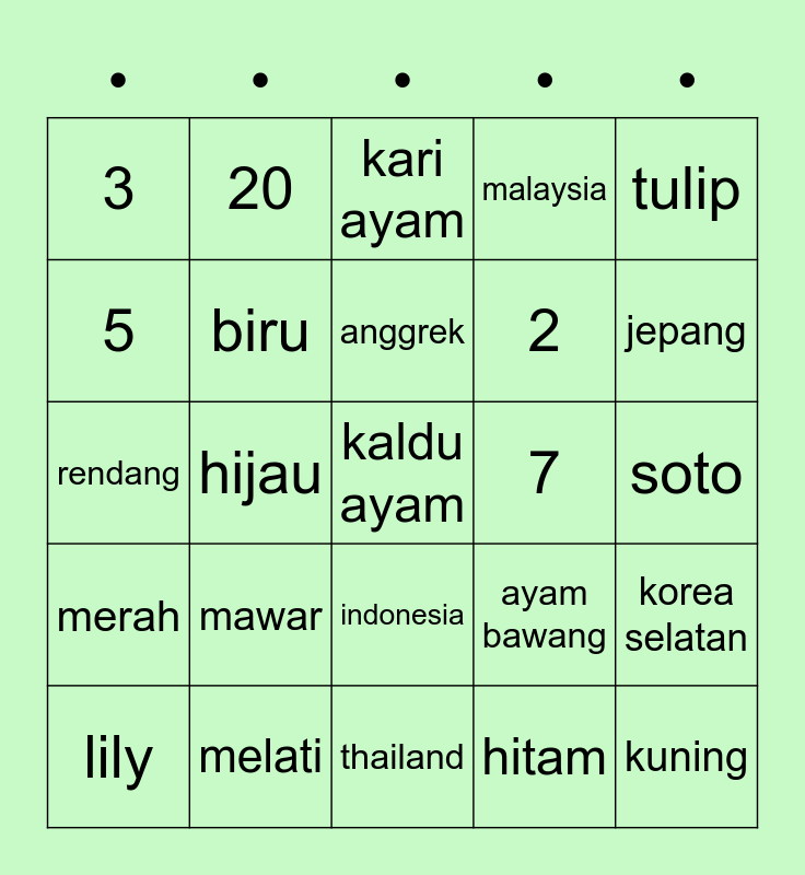This bingo card has a free space and 24 words: mawar, melati, anggrek, lily, tulip, 3, 5, 20, 7, indonesia, 2, rendang, ayam bawang, korea selatan, biru, hitam, soto, kari ayam, jepang, hijau, kuning, merah, malaysia and thailand.