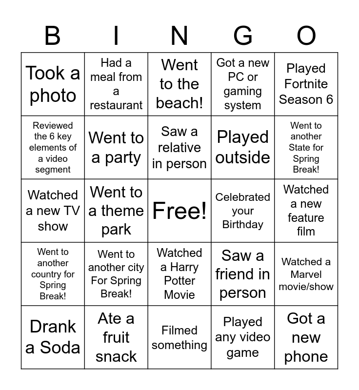 This bingo card has a free space and 24 words: Went to another city For Spring Break!, Ate a fruit snack, Saw a relative in person, Drank a Soda, Played Fortnite Season 6, Took a photo, Reviewed the 6 key elements of a video segment, Had a meal from a restaurant, Celebrated your Birthday, Watched a Harry Potter Movie, Played outside, Watched a new TV show, Saw a friend in person, Watched a Marvel movie/show, Went to a party, Played any video game, Watched a new feature film, Went to the beach!, Went to another State for Spring Break!, Went to a theme park, Got a new phone, Went to another country for Spring Break!, Got a new PC or gaming system and Filmed something.