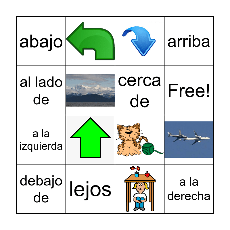 This bingo card has 8 images and 9 words: debajo de, abajo, arriba, cerca de, Free!, lejos, al lado de, a la izquierda and a la derecha.