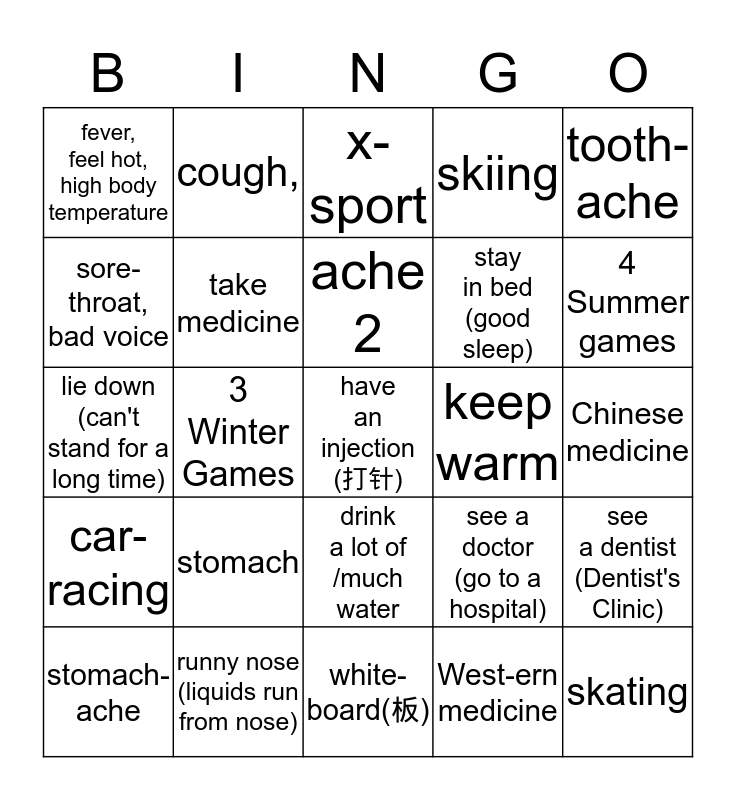 This bingo card has a free space and 24 words: stomach, runny nose (liquids run from nose), ache 2, stomach- ache, tooth- ache, fever, feel hot, high body temperature, sore- throat, bad voice, cough,, keep warm, drink a lot of /much water, stay in bed (good sleep), lie down (can't stand for a long time), see a doctor (go to a hospital), see a dentist (Dentist's Clinic), take medicine, West-ern medicine, Chinese medicine, x-sport, 4 Summer games, 3 Winter Games, skating, car-racing, skiing and white- board(板).