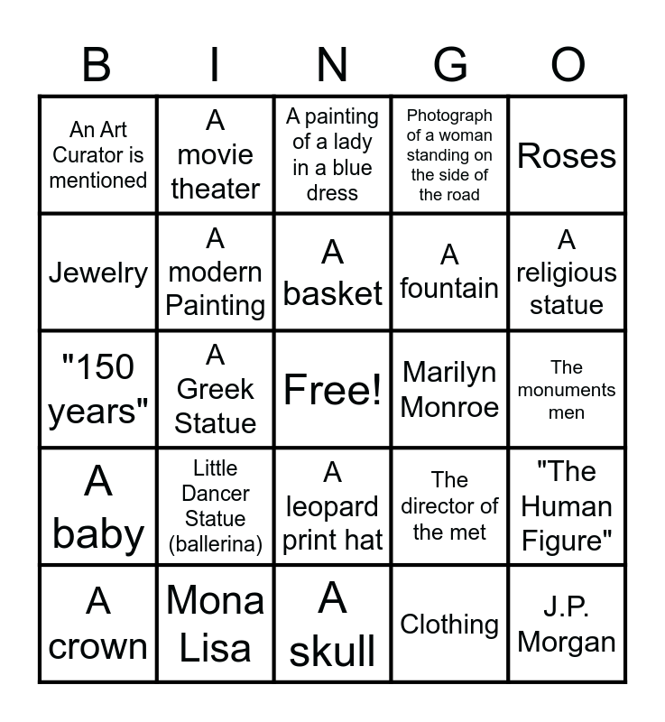 This bingo card has a free space and 29 words: A crown, Something Egyptian, A Greek Statue, A quilt, An Art Curator is mentioned, A painting of a lady in a blue dress, A modern Painting, Little Dancer Statue (ballerina), Marilyn Monroe, Mona Lisa, The monuments men, J.P. Morgan, A skull, Clothing, A religious statue, A bust (a statue of a just a head), A leopard print hat, A baby, Roses, "150 years", The director of the met, mention of covid safety measures, A fountain, Jewelry, Photograph of a woman standing on the side of the road, A movie theater, "The Human Figure", A basket and An instrument.