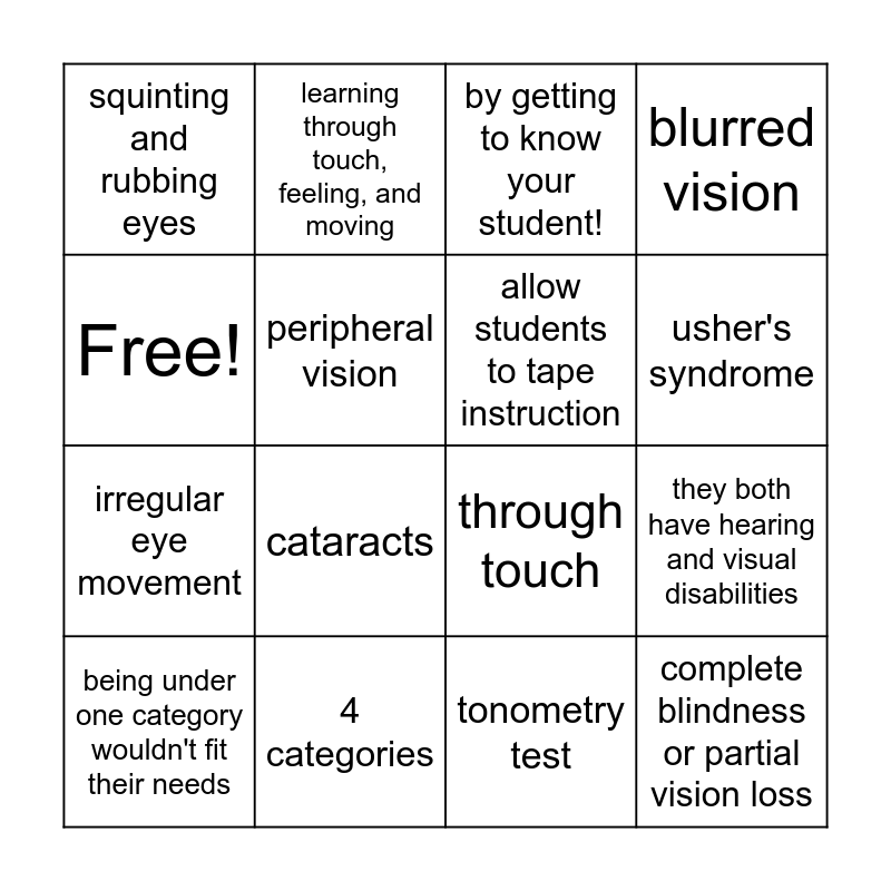 This bingo card has 16 words: 4 categories, they both have hearing and visual disabilities, by getting to know your student!, squinting and rubbing eyes, irregular eye movement, learning through touch, feeling, and moving, through touch, tonometry test, Free!, peripheral vision, being under one category wouldn't fit their needs, blurred vision, cataracts, usher's syndrome, allow students to tape instruction and complete blindness or partial vision loss.
