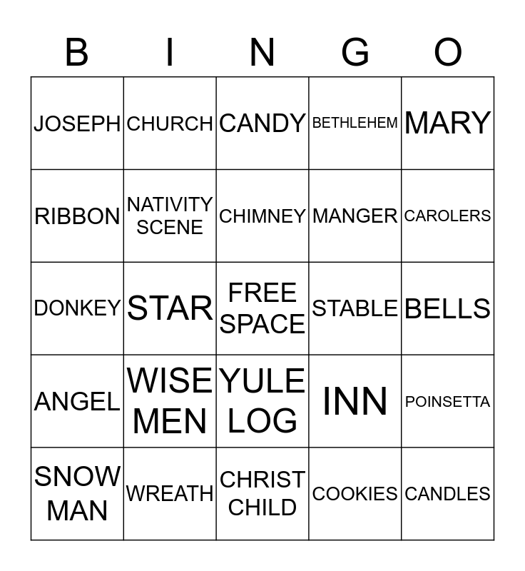 This bingo card has a free space and 24 words: WISE MEN, WREATH, CHIMNEY, SNOW MAN, MARY, JOSEPH, RIBBON, CHURCH, STABLE, YULE LOG, MANGER, DONKEY, INN, POINSETTA, NATIVITY SCENE, COOKIES, BELLS, CANDY, CAROLERS, STAR, CANDLES, ANGEL, BETHLEHEM and CHRIST CHILD.