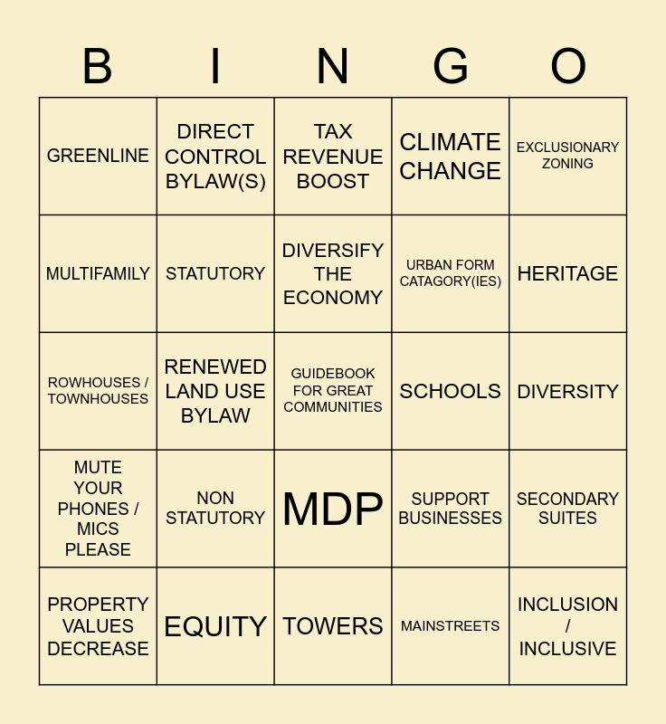 This bingo card has a free space and 29 words: PROPERTY VALUES DECREASE, RDNSQR, RENEWED LAND USE BYLAW, PARKING ISSUES, GREENLINE, TAX REVENUE BOOST, STATUTORY, NON STATUTORY, SCHOOLS, EQUITY, DIVERSITY, INCLUSION / INCLUSIVE, TOWERS, MAINSTREETS, HERITAGE, LOCAL AREA PLAN(S), MDP, MUTE YOUR PHONES / MICS PLEASE, EXCLUSIONARY ZONING, ROWHOUSES / TOWNHOUSES, SUPPORT BUSINESSES, CONTEXTUAL, URBAN FORM CATAGORY(IES), MULTIFAMILY, CLIMATE CHANGE, DIRECT CONTROL BYLAW(S), SECONDARY SUITES, DIVERSIFY THE ECONOMY and RENTERS / RENTALS.