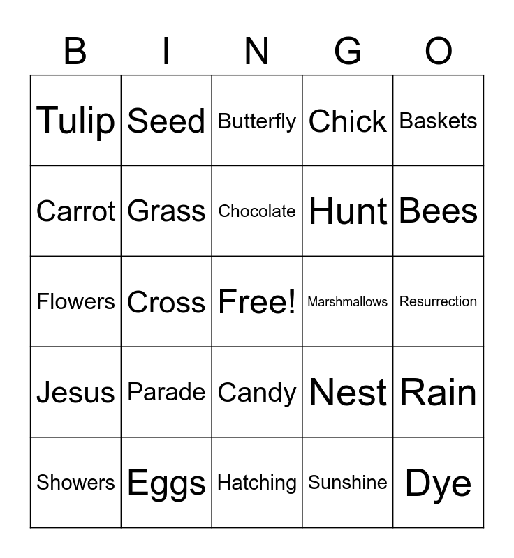 This bingo card has a free space and 40 words: Bunny, Flowers, Sun, Grass, Eggs, Candy, Chocolate, Jelly Beans, Baskets, Jesus, Cross, Chick, Dye, Resurrection, Marshmallows, Parade, Peeps, Tulip, Savior, Butterfly, Rain, Sunshine, Hunt, Carrot, Bonnet, Sprout, Birth, Race, Bloom, Garden, Cleaning, Showers, Baseball, Nest, Bees, Hatching, Ducks, Kite, Seed and Growth.