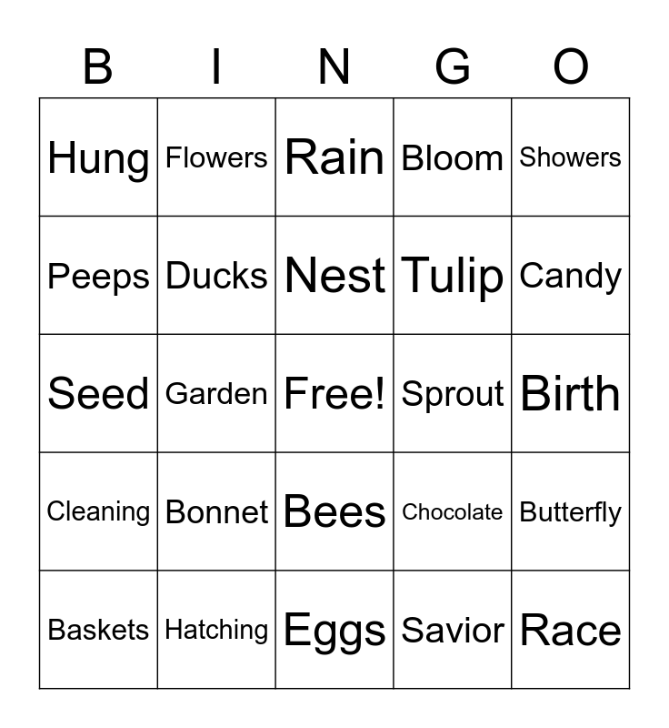 This bingo card has a free space and 40 words: Growth, Seed, Kite, Ducks, Hatching, Bees, Nest, Baseball, Showers, Cleaning, Garden, Bloom, Race, Birth, Sprout, Bonnet, Carrot, Hung, Frogs, Rain, Butterfly, Savior, Tulip, Peeps, Parade, Marshmallows, Resurrection, Dye, Chick, Cross, Jesus, Baskets, Jelly Beans, Chocolate, Candy, Eggs, Grass, Sun, Flowers and Bunny.
