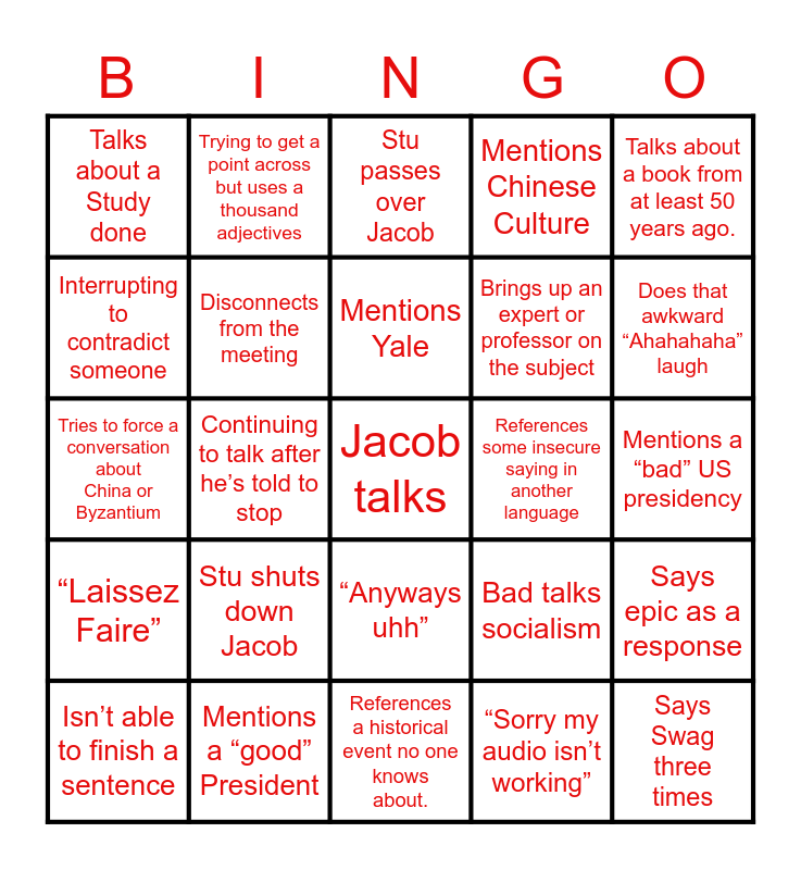 This bingo card has a free space and 24 words: Stu shuts down Jacob, Mentions a “good” President, Mentions Yale, Isn’t able to finish a sentence, Talks about a book from at least 50 years ago., Talks about a Study done, Interrupting to contradict someone, Trying to get a point across but uses a thousand adjectives, References some insecure saying in another language, “Anyways uhh”, Brings up an expert or professor on the subject, Tries to force a conversation about China or Byzantium, Bad talks socialism, Says epic as a response, Disconnects from the meeting, “Sorry my audio isn’t working”, Mentions a “bad” US presidency, Stu passes over Jacob, Does that awkward “Ahahahaha” laugh, Continuing to talk after he’s told to stop, Says Swag three times, “Laissez Faire”, Mentions Chinese Culture and References a historical event no one knows about..