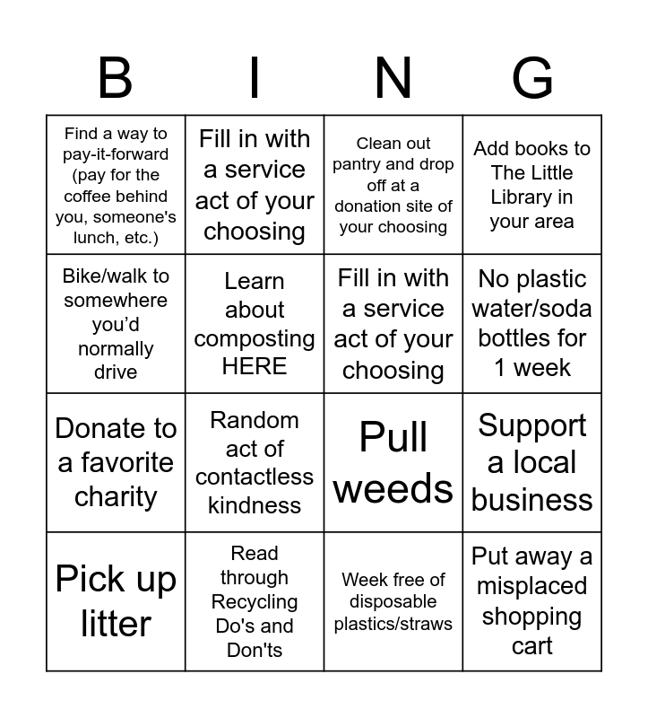 This bingo card has 16 words: Pick up litter, Read through Recycling Do's and Don'ts, Clean out pantry and drop off at a donation site of your choosing, Add books to The Little Library in your area, Bike/walk to somewhere you’d normally drive, Fill in with a service act of your choosing, Pull weeds, Support a local business, Find a way to pay-it-forward (pay for the coffee behind you, someone's lunch, etc.), Learn about composting HERE, Week free of disposable plastics/straws, No plastic water/soda bottles for 1 week, Donate to a favorite charity, Random act of contactless kindness, Fill in with a service act of your choosing and Put away a misplaced shopping cart.