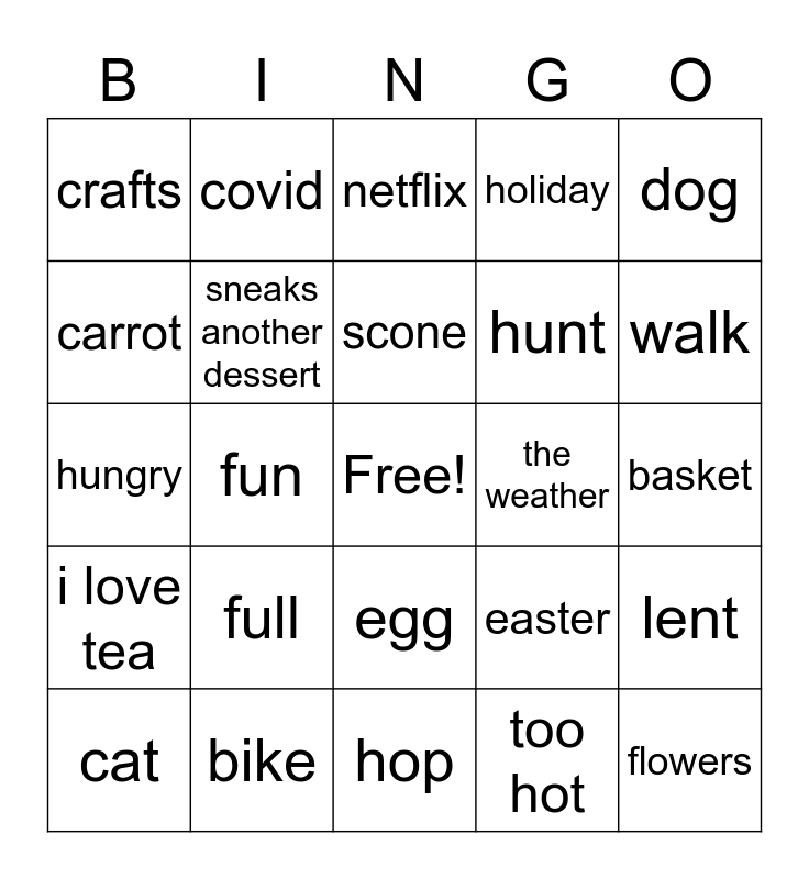 This bingo card has a free space and 34 words: Adds more sugar, too hot, spills, too cold, i love tea, sneaks another dessert, dog, cat, covid, lockdown, scone, netflix, disney, cake chocolate, the weather, walk, bike, hungry, full, easter, egg, bunny, crafts, basket, hop, flowers, holiday, cottontail, hunt, carrot, celebration, fun, lent and spring.