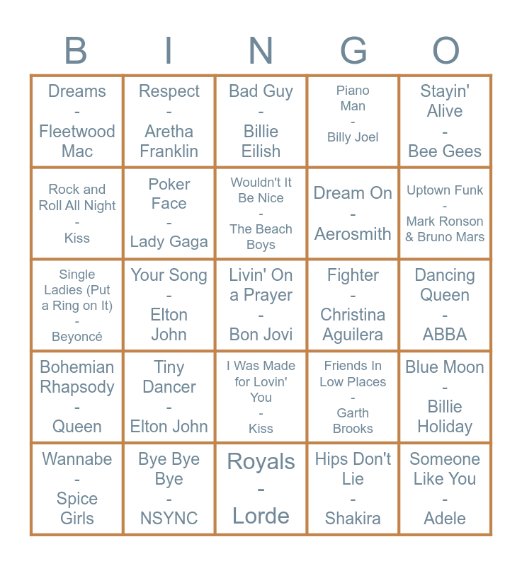 This bingo card has 65 words: Rock Around the Clock - Bill Hayley and the Commets, All I Have to Do Is Dream - The Everly Brothers, Jailhouse Rock - Elvis Presley, Blue Moon - Billie Holiday, Hit the Road Jack - Ray Charles, You Can't Hurry Love - The Supremes, Respect - Aretha Franklin, Hey Jude - The Beatles, Wouldn't It Be Nice - The Beach Boys, The Sound of Silence - Simon & Garfunkel, I Was Made for Lovin' You - Kiss, Rich Girl - Hall & Oates, Dancing Queen - ABBA, Stayin' Alive - Bee Gees, You're So Vain - Carly Simon, Rock and Roll All Night - Kiss, Your Song - Elton John, Dreams - Fleetwood Mac, Y.M.C.A - Village People, Dream On - Aerosmith, Tiny Dancer - Elton John, Bohemian Rhapsody - Queen, Piano Man - Billy Joel, I Wanna Dance with Somebody - Whitney Houston, Total Eclipse of the Heart - Bonnie Tyler, Love Shack - The B-52s, Don't Stop Believin' - Journey, Love is a Battlefield - Pat Benatar, Livin' On a Prayer - Bon Jovi, Like a Prayer - Madonna, Wannabe - Spice Girls, Wonderwall - Oasis, Smells Like Teen Spirit - Nirvana, Man! I Feel Like a Woman! - Shania Twain, Friends In Low Places - Garth Brooks, Bye Bye Bye - NSYNC, In Da Club - 50 Cent, Single Ladies (Put a Ring on It) - Beyoncé, Hips Don't Lie - Shakira, Mr. Brightside - The Killers, Poker Face - Lady Gaga, Oops!...I Did It Again - Britney Spears, Fighter - Christina Aguilera, We Belong Together - Mariah Carey, Dani California - The Red Hot Chili Peppers, Sk8tr Boy - Avril Lavigne, Uptown Funk - Mark Ronson & Bruno Mars, Can't Feel My Face - The Weeknd, Someone Like You - Adele, Shake It Off - Taylor Swift, Diamonds - Rhianna, Shape of You - Ed Sheeran, Wrecking Ball - Miley Cyrus, Royals - Lorde, Wake Me Up - Avicii, Sorry - Justin Bieber, I Like It - Cardi B, Bad Guy - Billie Eilish, Thank You, Next - Ariana Grande, Truth Hurts - Lizzo, Rain On Me - Lady Gaga & Ariana Grande, Levitating - Dua Lipa, Drivers License - Olivia Rodrigo, Savage - Megan Thee Stallion and How You Like That - BLACKPINK.