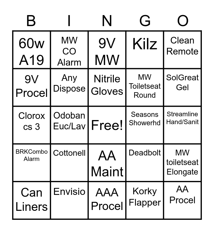 This bingo card has a free space and 24 words: Cottonell, Envisio, Nitrile Gloves, Can Liners, Clean Remote, 60w A19, 9V Procel, MW CO Alarm, Seasons Showerhd, AA Maint, MW Toiletseat Round, Clorox cs 3, Deadbolt, MW toiletseat Elongate, Any Dispose, Korky Flapper, Streamline Hand/Sanit, 9V MW, SolGreat Gel, Odoban Euc/Lav, AA Procel, BRKCombo Alarm, Kilz and AAA Procel.