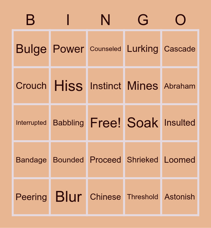 This bingo card has a free space and 35 words: Virginia, Plaque, Trespass, Hiss, Proceed, Lurking, Crouch, Retrieved, Instinct, Glimpse, Interrupted, Cascade, Frantic, Pursue, Bulge, Soak, Threshold, Babbling, Bandage, Astonish, Shrieked, Peering, Loomed, Blur, Counseled, Abraham, Lincoln, Cent, Mines, Insulted, Grandpa, Chinese, Bounded, Power and Latin.