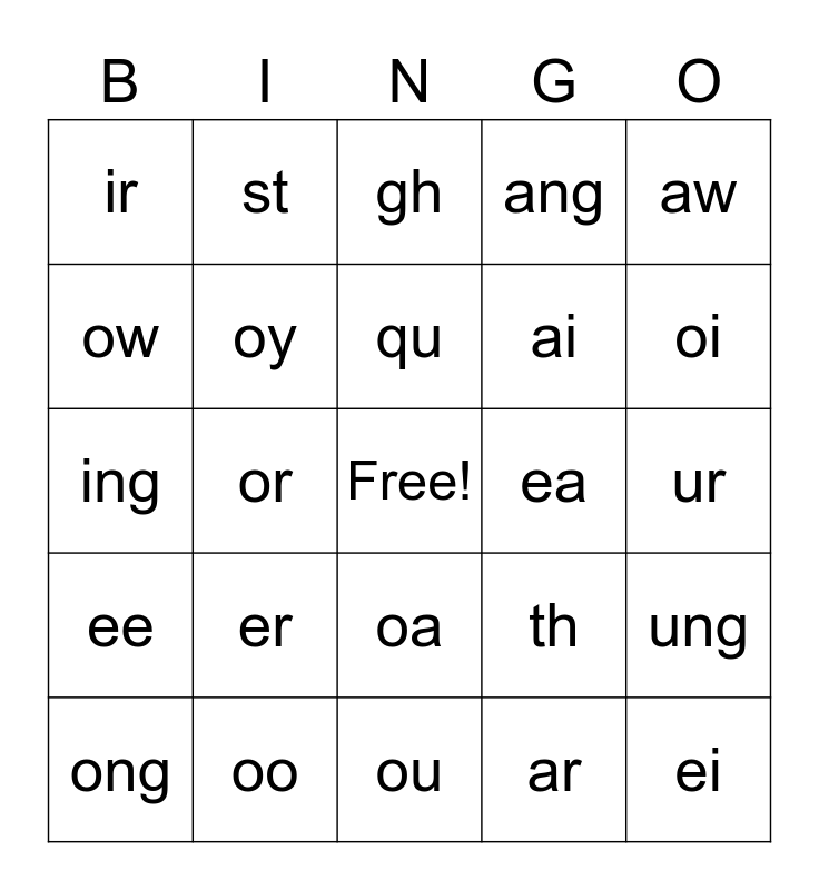 This bingo card has a free space and 27 words: th, wh, ai, ou, ow, gh, st, ee, ea, ung, ing, ang, ong, oo, oi, ph, oy, qu, er, ir, ur, ar, or, ei, oa, aw and sh.