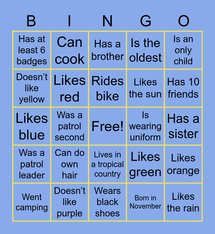 This bingo card has a free space and 24 words: Went camping, Can do own hair, Rides bike, Born in November, Is an only child, Has at least 6 badges, Can cook, Has a brother, Is wearing uniform, Has a sister, Likes blue, Likes red, Likes green, Likes orange, Doesn’t like yellow, Doesn’t like purple, Wears black shoes, Is the oldest, Has 10 friends, Was a patrol leader, Was a patrol second, Lives in a tropical country, Likes the sun and Likes the rain.