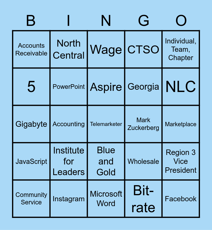 This bingo card has 64 words: Free!, FBLA, State President, Region 3 Vice President, National President, BAA, North Central, 9, Aspire, March of Dimes, Blue and Gold, Service, Education, Progress, Marketplace, Individual, Team, Chapter, 4, 5, Accounting, Accounts Receivable, Drew Lojewski, Georgia, Institute for Leaders, JavaScript, CTSO, Assets, Liabilities, Audit, Debt, Stock Market, GDP, DOW Jones, Import, Export, Bylaws, Robert’s Rules, NLC, Community Service, Patent, Bit-rate, Economics, PowerPoint, Gigabyte, Mark Zuckerberg, Bill Gates, Mark Cuban, Alex Graham, Telemarketer, Instagram, Facebook, Wholesale, Farmers’ Market, Chamber of Commerce, Janet Yellen, Microsoft Word, Microsoft Powerpoint, Elon Musk, Capital, Wage, Salary, Interest, Bonds, Bull Market, GameStop, Robinhood and Reston, VA.