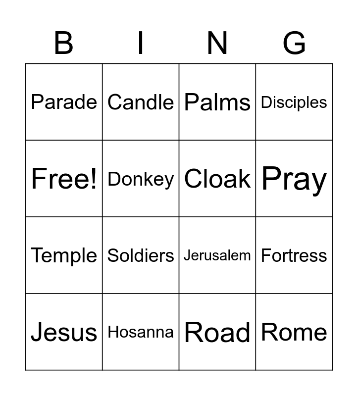 This bingo card has 16 words: Hosanna, Fortress, Palms, Parade, Temple, Candle, Jerusalem, Road, Free!, Donkey, Jesus, Disciples, Soldiers, Pray, Cloak and Rome.