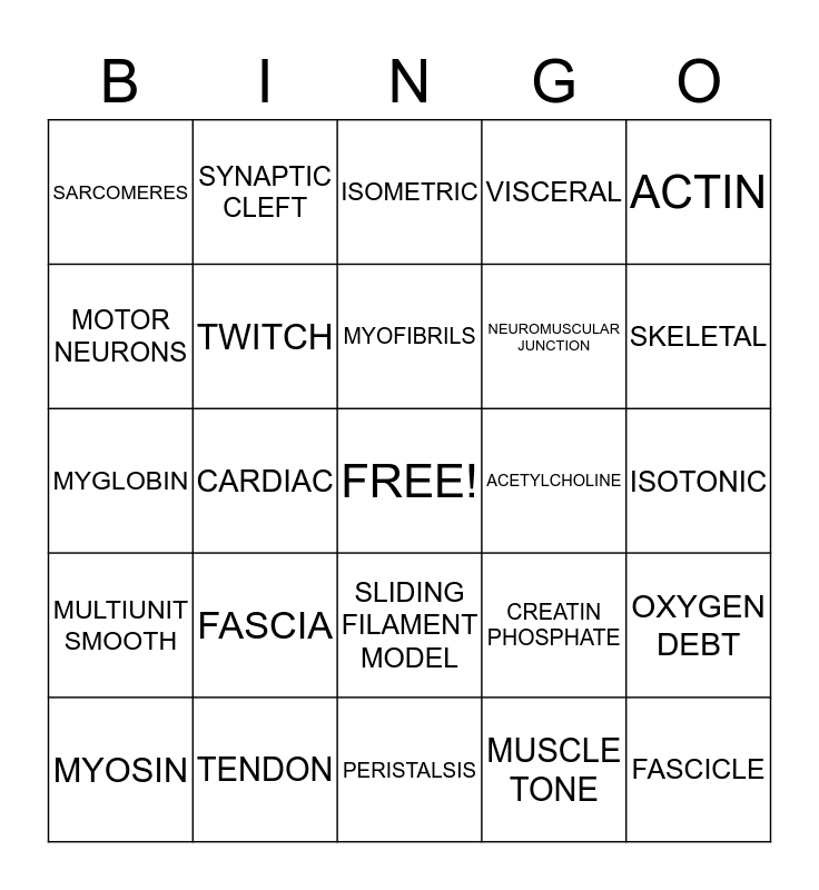 This bingo card has a free space and 24 words: FASCIA, TENDON, MYOFIBRILS, MYOSIN, ACTIN, SARCOMERES, MOTOR NEURONS, SYNAPTIC CLEFT, ACETYLCHOLINE, SLIDING FILAMENT MODEL, NEUROMUSCULAR JUNCTION, MYGLOBIN, CREATIN PHOSPHATE, OXYGEN DEBT, TWITCH, MUSCLE TONE, ISOTONIC, ISOMETRIC, SKELETAL, CARDIAC, FASCICLE, MULTIUNIT SMOOTH, VISCERAL and PERISTALSIS.