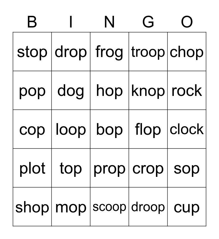 This bingo card has a free space and 24 words: top, mop, hop, shop, chop, stop, pop, drop, flop, prop, knop, cop, crop, sop, dog, droop, clock, frog, rock, loop, cup, plot, troop and scoop.