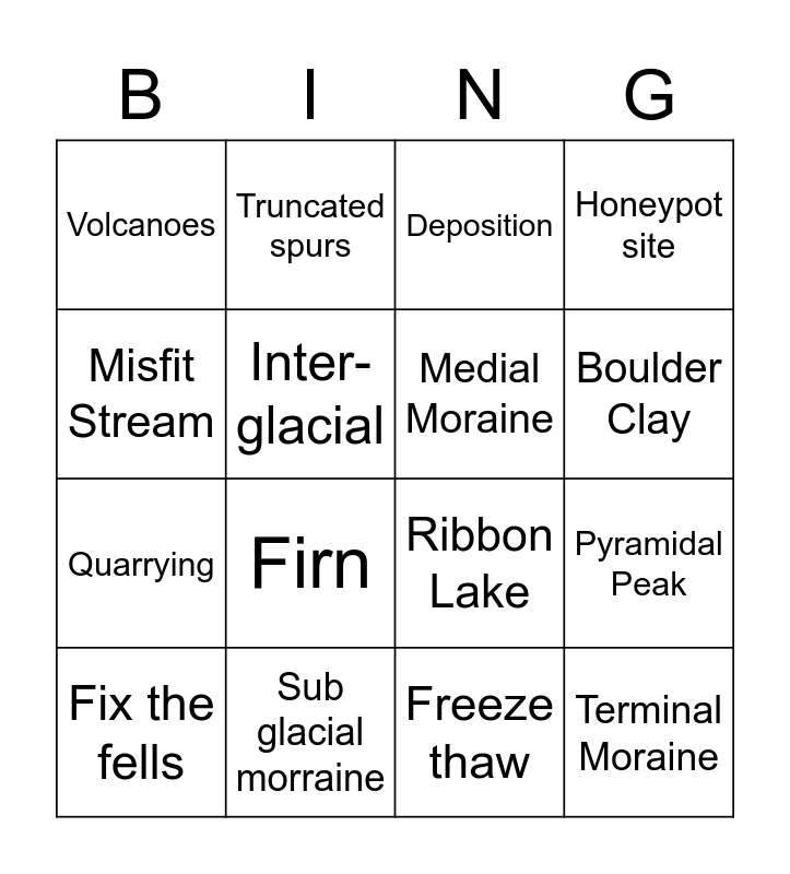 This bingo card has 32 words: Arete, Corrie, Pyramidal Peak, Glacier, Terminal Moraine, Medial Moraine, Misfit Stream, U-Shape Valley, Truncated spurs, Erosion, Boulder Clay, Deposition, Abrasion, Plucking, Sub glacial morraine, Hanging Valley, Supra Glacial material, Ribbon Lake, Drumlin, Erratic, Striations, Weathering, Freeze thaw, Ambleside, Fix the fells, Honeypot site, Quarrying, Inter-glacial, Volcanoes, Steep backwall, Deep hollow and Firn.