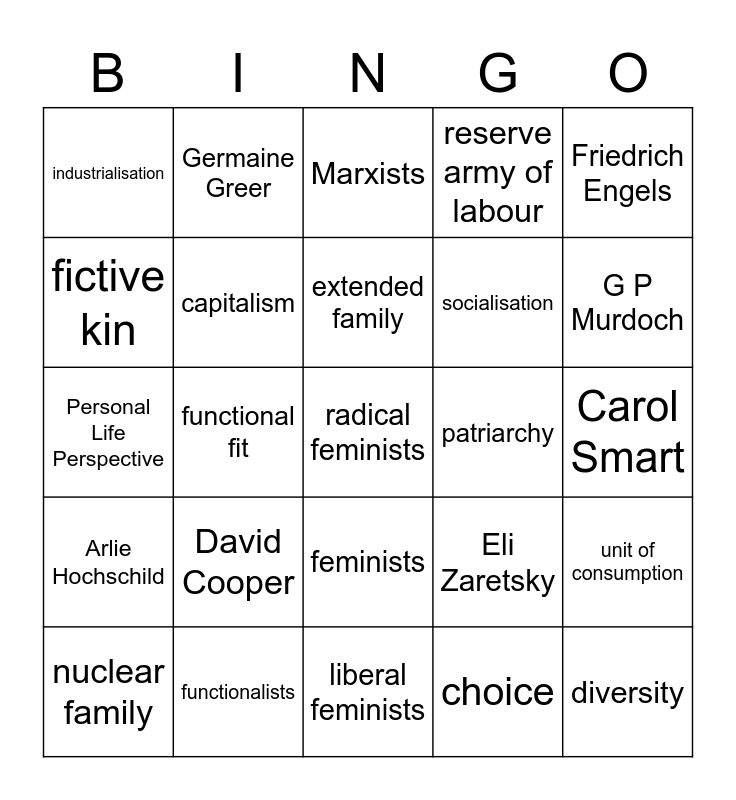 This bingo card has 30 words: functionalists, consensus, functional fit, mobile labour force, industrialisation, Marxists, capitalism, feminists, patriarchy, liberal feminists, Carol Smart, radical feminists, choice, diversity, G P Murdoch, Talcott Parsons, Eli Zaretsky, Arlie Hochschild, David Cooper, Friedrich Engels, Personal Life Perspective, Fran Ansley, Germaine Greer, socialisation, fictive kin, reserve army of labour, unit of consumption, nuclear family, extended family and structural theories.