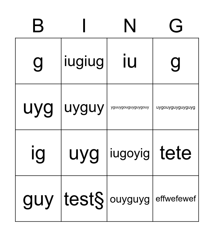 This bingo card has 16 words: test§, tete, iu, g, ig, iugiug, iugoyig, ouyguyg, uyg, uyguy, guy, g, uyg, uygouyguyguyguyg, yguuygouguyguygouy and effwefewef.