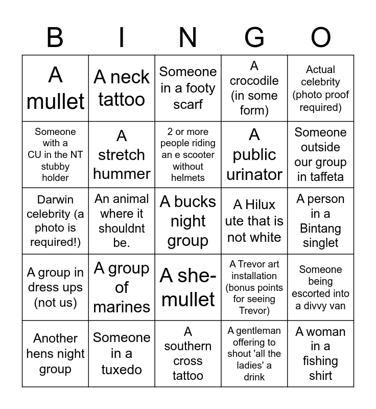 This bingo card has 25 words: A group of marines, A southern cross tattoo, 2 or more people riding an e scooter without helmets, Another hens night group, Actual celebrity (photo proof required), A mullet, Someone with a CU in the NT stubby holder, A neck tattoo, A Hilux ute that is not white, A she-mullet, A public urinator, Darwin celebrity (a photo is required!), A Trevor art installation (bonus points for seeing Trevor), Someone being escorted into a divvy van, A stretch hummer, A woman in a fishing shirt, A person in a Bintang singlet, Someone in a footy scarf, Someone outside our group in taffeta, An animal where it shouldnt be., A bucks night group, Someone in a tuxedo, A group in dress ups (not us), A crocodile (in some form) and A gentleman offering to shout 'all the ladies' a drink.