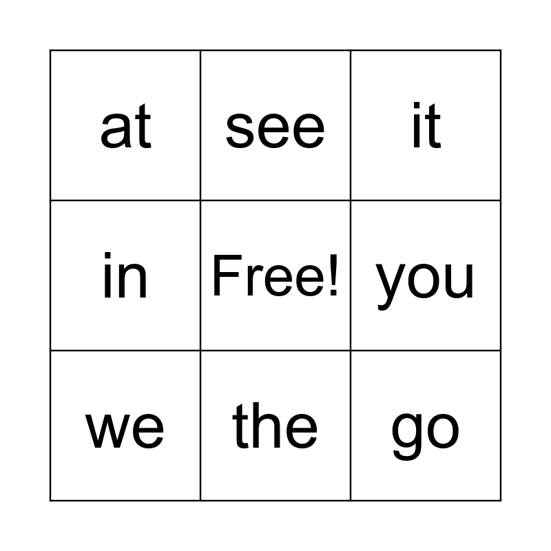This bingo card has a free space and 8 words: you, it, see, we, at, go, in and the.