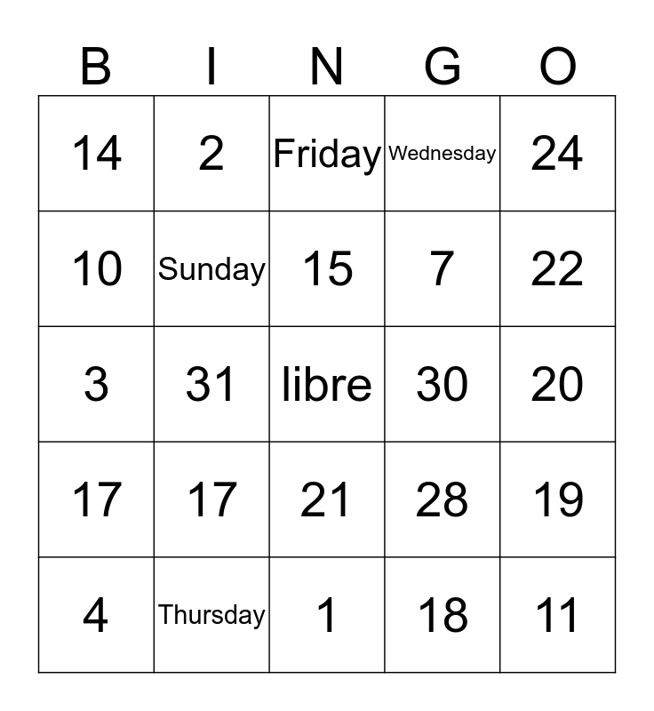 This bingo card has a free space and 36 words: 6, Monday, 13, Sunday, 28, 17, 15, 9, 24, Tuesday, 31, Wednesday, 25, 30, 22, 14, Saturday, 17, 11, Friday, 20, 19, Thursday, 4, 1, 2, 3, 5, 7, 10, 12, 16, 18, 21, 23 and 26.