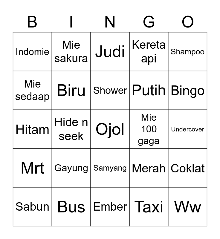 This bingo card has 25 words: Gayung, Ember, Shower, Sabun, Shampoo, Indomie, Mie sedaap, Mie sakura, Mie 100 gaga, Samyang, Putih, Hitam, Merah, Coklat, Biru, Ww, Undercover, Judi, Bingo, Hide n seek, Ojol, Bus, Mrt, Kereta api and Taxi.