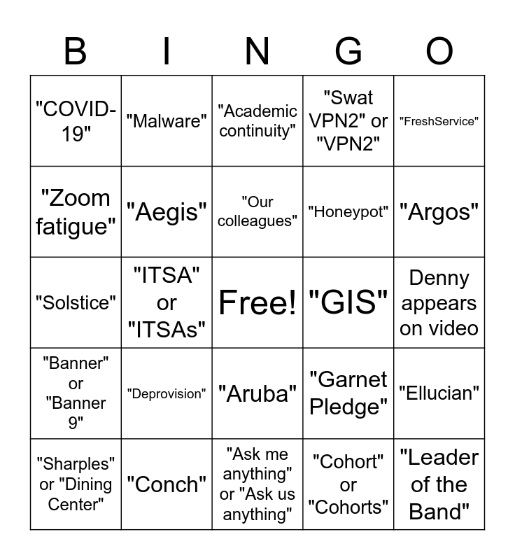 This bingo card has a free space and 133 words: "One more thing", Glenn appears on video, "Maintenance window", "Talking stick", "Shout out", People applauding (not Zoom reactions), "Banner" or "Banner 9", "Dovetail" or "dovetailing", Eating on camera, "Juniper", "Offline", "Singer", "...get started", Dave Neal royal wave, "China", Animal/human walks through field of vision, "AWS", One of Jeff's cats types on a keyboard, Jeff appears *without* a Zoom background, "Moodle", "Proactive", "Conch", "Leader of the Band", At least five simultaneous on-screen Zoom reactions, All directors are present, "Power Over Ethernet" or "POE", "Our colleagues", "Board", "F5", "Palo Alto", "Honeypot", "Malware", "Ellucian", "Argos", "Slack", "Swat VPN" or "VPN", "Issues", "Nutshell", "Tripwire", "Endowment", "Swat VPN2" or "VPN2", "Haiku", "Financial Planning", "Val", "Sarah", "The Core", "Subnets" or "Subnet", "Strelka", "GIS", "FreshService", "KB", "Documentation", "The Dash", "eduroam", "CrashPlan" or "Code 42", "LinkedIn Learning", "MySwarthmore" or "MySwat", "The Blog", "Shibboleth" or "Shib", "ITSA" or "ITSAs", "Solstice", "Crestron", "101", "401" or "401 North Broad", "Adobe", "CAS", "Tomcat", "Echo", "Piggyback", "Zoom fatigue", "Foreseeable future", "Aruba", “Hollywood Squares”, “Brady Bunch”, “Budget”, Three or more people take a sip from a cup/mug at the same time, “Accessibility”, "Martin" (the building), "Martin" (the Reynolds), Glenn calls in with his home number, Don makes the meeting unsecured because of his phone, "Hybrid" or "HyFlex", "Fischer", Denny appears on video, "Infoblox", "Solarwinds", "IOT" or "Internet of things", "Constituo", "Acalog", "Jabber", "Aegis", "Open it up" or "Open up the floor", "Leverage", "Fiber", "Ask me anything" or "Ask us anything", "New normal", "Lesa", "Jim" (the Terhune), "Jim" (the Bock), "Jim" (the Adams), "Equipment", "Deprovision", "Academic continuity", "PECO", "Financial Study Group", "CLAC", "Dining Center", "Mindshare", "Keyserver", "Office hours scheduler", Mike Jones is in a car or a tent, "Sharples" or "Dining Center", "Greg", "Cohort" or "Cohorts", "Town hall", "Adirondack", "Outage", "COVID-19", "Protocol", "Garnet Pledge", "Load balancing", "Hopkins", "VLANs", "UPS", "SSO" or "Single sign-on", "Retirement", "Virtual commencement", "Graduation", Jeff writes a pun/haiku/song and shares on video or in chat, Mike Patterson acknowledges Andrew's Zoom situation on Zoom or in chat, "Registrar" or "Registrars" or "Registrar's" (like you could discern the second and third!), "Honors" and "Alumni Weekend".