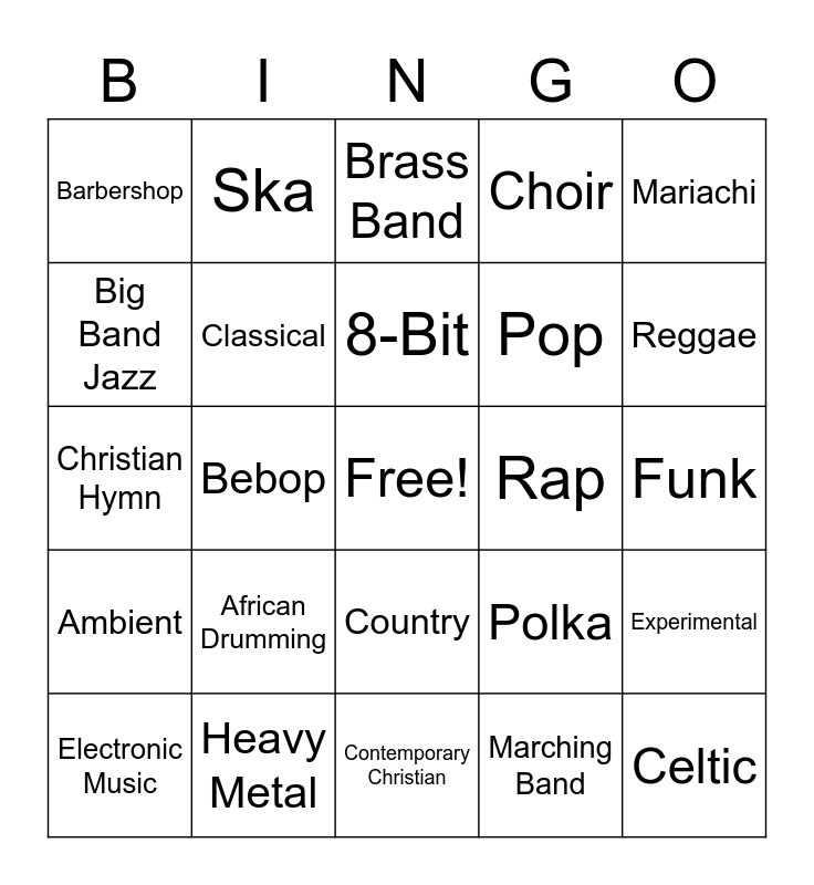 This bingo card has a free space and 34 words: Alternative Rock, Marching Band, Lo-Fi, Medieval Chant, Ambient, Classical, Mariachi, Electronic Music, Ska, Folk, 8-Bit, Brass Band, Latin American, Blues, Rap, Reggae, Heavy Metal, Christian Hymn, African Drumming, Polka, Country, Musical Theater, Barbershop, Funk, Contemporary Christian, Celtic, Choir, Movie Soundtrack, Pop, Big Band Jazz, Classic Rock, Bebop, Experimental and Traditional Chinese Music.