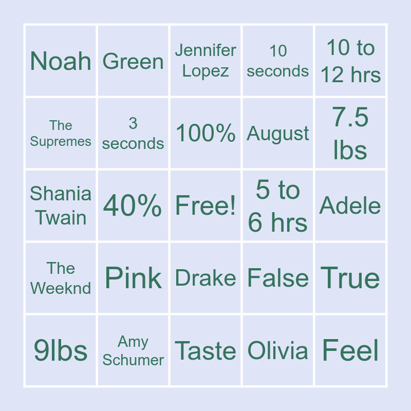 This bingo card has a free space and 47 words: Touch, Feel, See, Taste, Pink, Blue, Green, Swallow + breathe, The Supremes, 2 seconds, 3 seconds, 10 seconds, True, False, 25%, 30%, 100%, 5 to 6 hrs, 3 to 4 hrs, 10 to 12 hrs, 40%, Olivia, Noah, August, January, 7.5 lbs, 9lbs, Brad Pitt, Drake, The Weeknd, Julia Roberts, Kevin Hart, Oprah, Michelle Obama, The Rock, Amy Schumer, Adele, Keke Palmer, Scarlett Johansson, Meryl Streep, Jennifer Anniston, Jennifer Lopez, Shania Twain, Ryan Reynolds, Beyonce, Jamie Foxx and Greta Thunberg.
