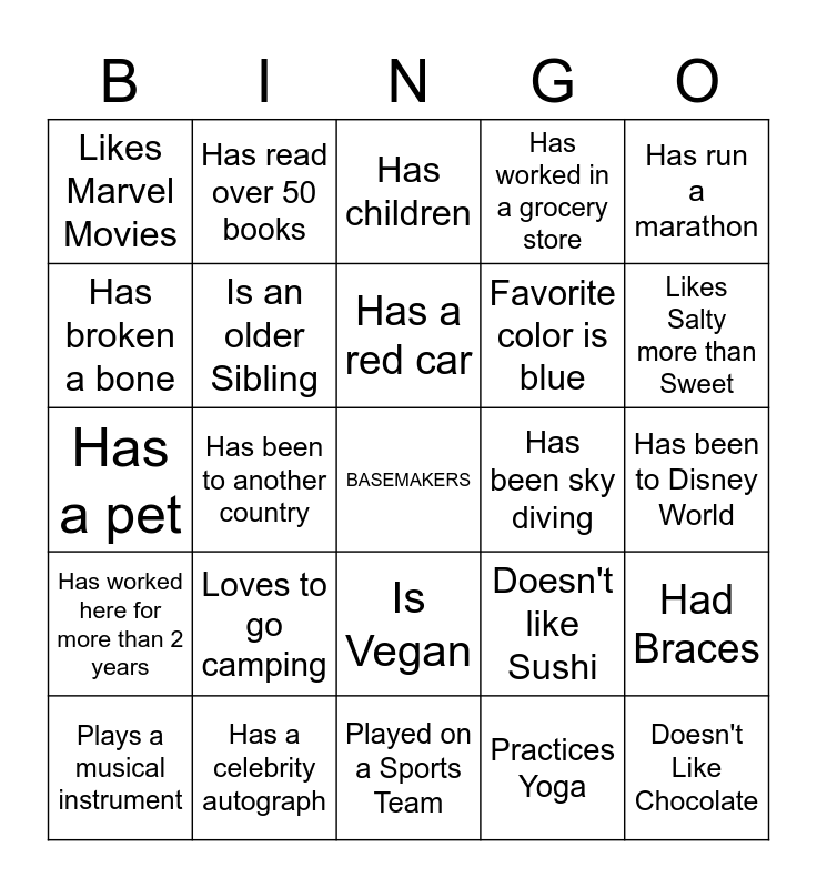 This bingo card has a free space and 24 words: Loves to go camping, Has a celebrity autograph, Has a red car, Plays a musical instrument, Has run a marathon, Likes Marvel Movies, Has broken a bone, Has read over 50 books, Has been sky diving, Is Vegan, Favorite color is blue, Has a pet, Doesn't like Sushi, Had Braces, Is an older Sibling, Practices Yoga, Has been to Disney World, Has children, Likes Salty more than Sweet, Has been to another country, Doesn't Like Chocolate, Has worked here for more than 2 years, Has worked in a grocery store and Played on a Sports Team.
