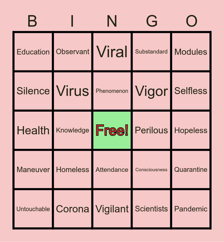 This bingo card has a free space and 29 words: Someone, Corona, Viral, Hilarious, Modules, Education, Virus, Phenomenon, Perilous, Quarantine, Untouchable, Knowledge, Scientists, Pandemic, Health, Protocol, Vigilant, Consciousness, Selfless, Maneuver, Homeless, Gallant, Vigor, Hopeless, Silence, Observant, Attendance, Substandard and Permanent.