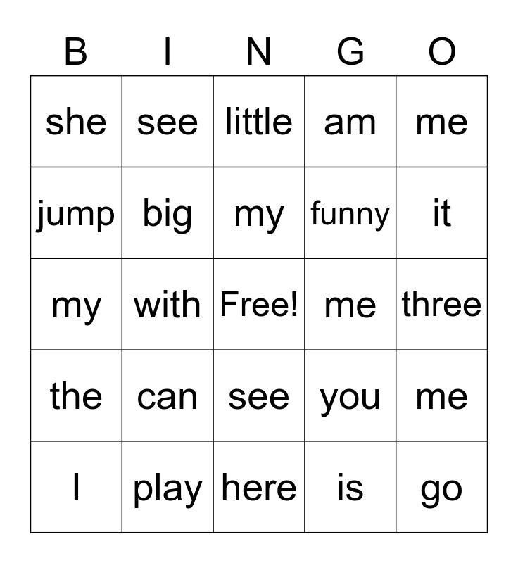 This bingo card has a free space and 29 words: I, a, with, he, she, little, big, can, me, play, three, go, here, is, it, look, see, the, me, my, you, yellow, funny, jump, am, see, me, my and look.
