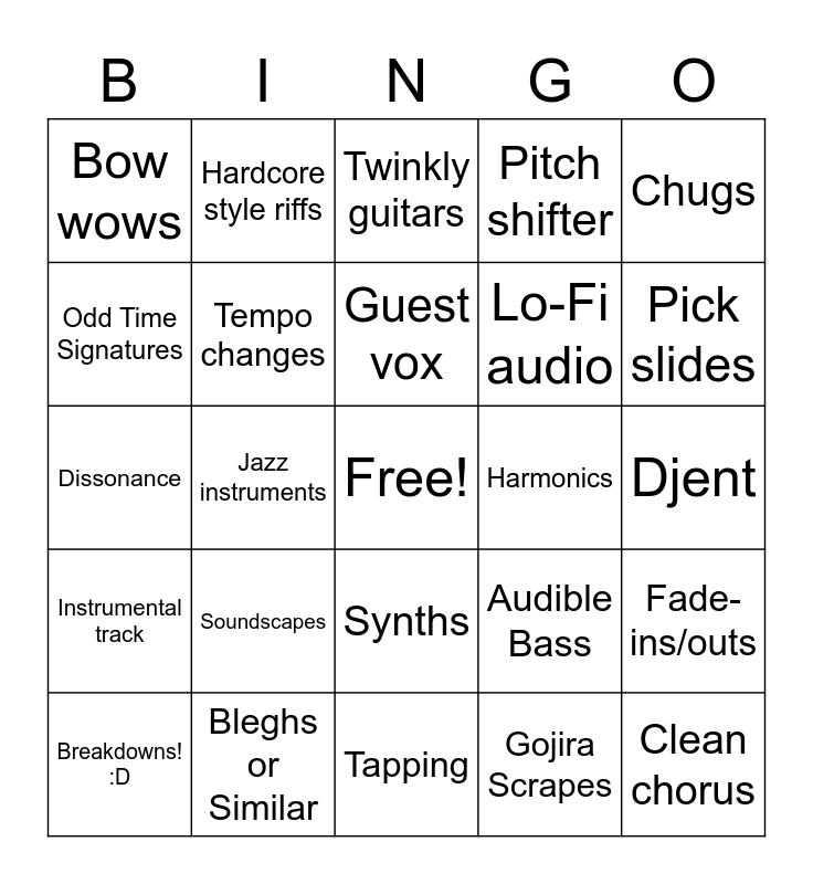 This bingo card has a free space and 24 words: Soundscapes, Bleghs or Similar, Guest vox, Breakdowns! :D, Chugs, Bow wows, Odd Time Signatures, Hardcore style riffs, Harmonics, Synths, Lo-Fi audio, Dissonance, Audible Bass, Fade-ins/outs, Tempo changes, Gojira Scrapes, Djent, Twinkly guitars, Pick slides, Jazz instruments, Clean chorus, Instrumental track, Pitch shifter and Tapping.