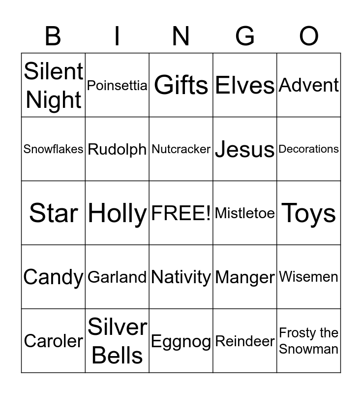 This bingo card has a free space and 24 words: Garland, Silver Bells, Nutcracker, Caroler, Advent, Silent Night, Snowflakes, Poinsettia, Mistletoe, Nativity, Jesus, Star, Manger, Wisemen, Rudolph, Reindeer, Toys, Gifts, Decorations, Holly, Frosty the Snowman, Candy, Elves and Eggnog.