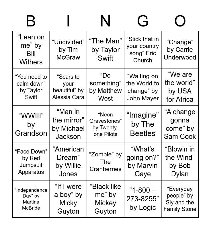 This bingo card has 28 words: “Blowin in the Wind” by Bob Dylan, “Changes” by Tupac, “Waiting on the World to change” by John Mayer, “1-800 – 273-8255” by Logic, “You need to calm down” by Taylor Swift, “The Man” by Taylor Swift, “Undivided” by Tim McGraw, “Face Down” by Red Jumpsuit Apparatus, “Imagine” by The Beetles, “Independence Day” by Martina McBride, “WWIII” by Grandson, “Stick that in your country song” Eric Church, “If I were a boy” by Micky Guyton, “Black like me” by Mickey Guyton, “We are the world” by USA for Africa, “Courtesy the red, white, and blue” by Toby Keith, “American Dream” by Willie Jones, “Scars to your beautiful” by Alessia Cara, “Do something” by Matthew West, “Zombie” by The Cranberries, “Lean on me” by Bill Withers, “Everyday people” by Sly and the Family Stone, “Neon Gravestones” by Twenty-one Pilots, “Man in the mirror” by Michael Jackson, “A change gonna come” by Sam Cook, “What’s going on?” by Marvin Gaye, “Change” by Carrie Underwood and “What it’s like” by Everlast.
