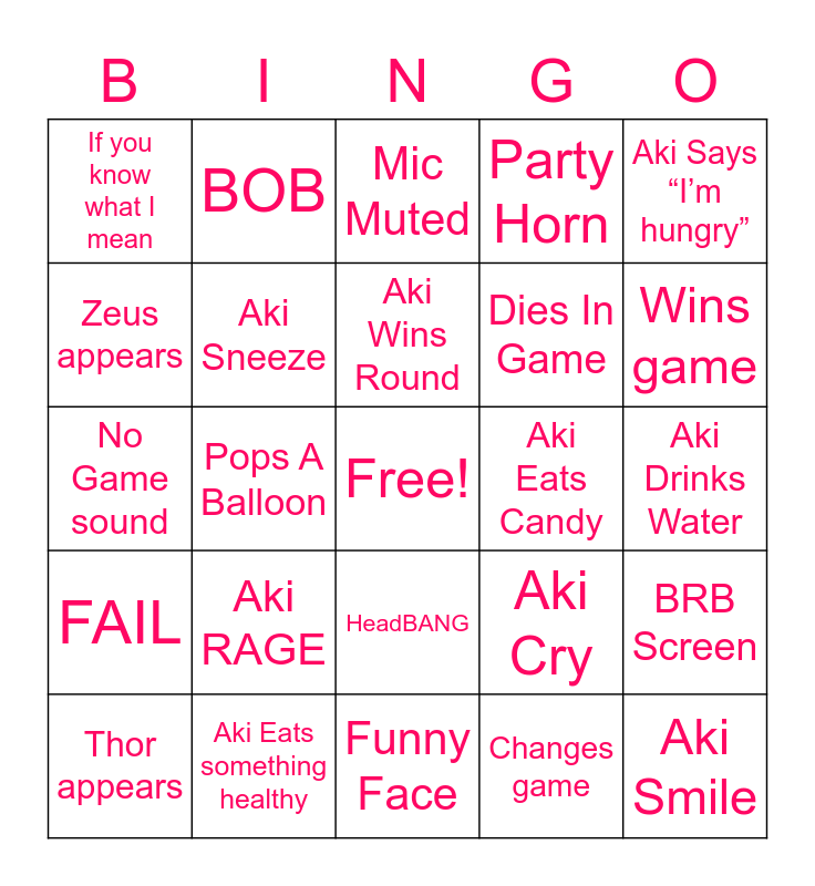 This bingo card has a free space and 24 words: Aki RAGE, Aki Eats something healthy, Aki Wins Round, Thor appears, Aki Says “I’m hungry”, If you know what I mean, Zeus appears, BOB, Aki Eats Candy, HeadBANG, Dies In Game, No Game sound, Aki Cry, BRB Screen, Aki Sneeze, Changes game, Aki Drinks Water, Mic Muted, Wins game, Pops A Balloon, Aki Smile, FAIL, Party Horn and Funny Face.