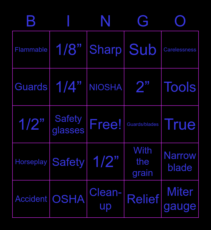 This bingo card has a free space and 24 words: Safety, OSHA, NIOSHA, Accident, Carelessness, Flammable, Guards, 1/8”, Guards/blades, 1/2”, 2”, 1/2”, With the grain, Narrow blade, 1/4”, Relief, True, Sharp, Tools, Safety glasses, Miter gauge, Horseplay, Sub and Clean-up.