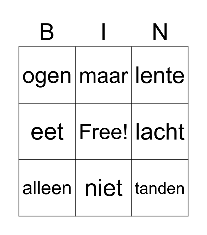 This bingo card has a free space and 10 words: niet, lente, ogen, tanden, eet, alleen, maar, altijd, lacht and maakt.