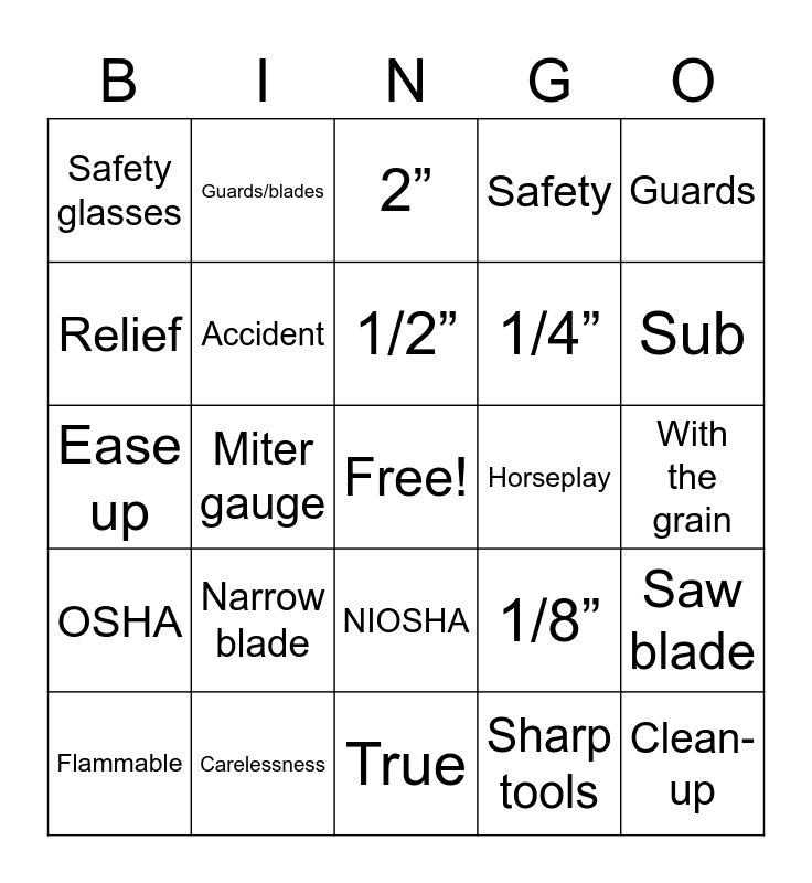 This bingo card has a free space and 24 words: Narrow blade, Carelessness, 1/2”, Flammable, Guards, Safety glasses, Relief, Guards/blades, Horseplay, NIOSHA, 1/4”, Ease up, 1/8”, Saw blade, Accident, Sharp tools, With the grain, 2”, Sub, Miter gauge, Clean-up, OSHA, Safety and True.