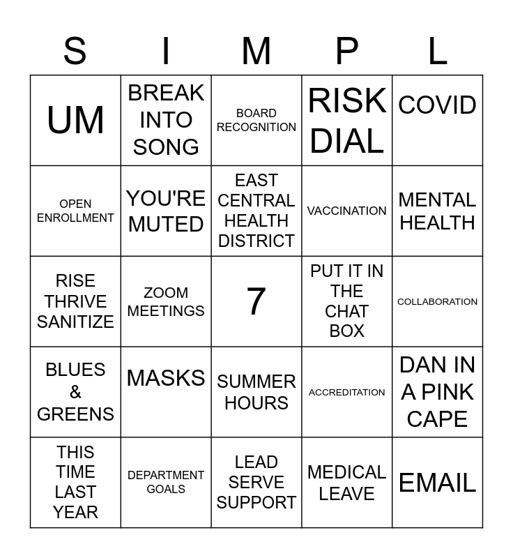 This bingo card has a free space and 24 words: MASKS, DEPARTMENT GOALS, EAST CENTRAL HEALTH DISTRICT, THIS TIME LAST YEAR, COVID, UM, OPEN ENROLLMENT, BREAK INTO SONG, PUT IT IN THE CHAT BOX, SUMMER HOURS, VACCINATION, RISE THRIVE SANITIZE, ACCREDITATION, DAN IN A PINK CAPE, YOU'RE MUTED, MEDICAL LEAVE, COLLABORATION, BOARD RECOGNITION, MENTAL HEALTH, ZOOM MEETINGS, EMAIL, BLUES & GREENS, RISK DIAL and LEAD SERVE SUPPORT.