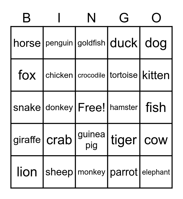 This bingo card has a free space and 37 words: bear, bird, cat, chicken, cow, crab, crocodile, deer, dog, dolphin, donkey, duck, elephant, fish, fox, giraffe, goat, goldfish, guinea pig, hamster, horse, kitten, lion, monkey, octopus, parrot, penguin, pig, puppy, rabbit, shark, sheep, snake, starfish, tiger, tortoise and wolf.