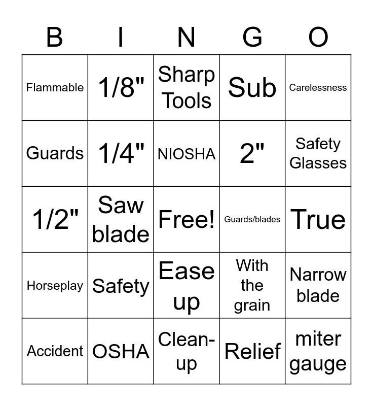 This bingo card has a free space and 24 words: Safety, OSHA, NIOSHA, Accident, Carelessness, Flammable, Guards, 1/8", Guards/blades, Ease up, 2", 1/2", With the grain, Narrow blade, 1/4", Relief, True, Sharp Tools, Safety Glasses, Saw blade, miter gauge, Horseplay, Sub and Clean-up.