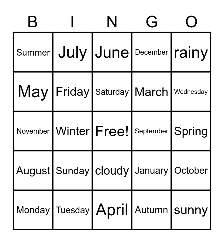 This bingo card has a free space and 27 words: January, February, March, April, May, June, July, August, September, October, November, December, Monday, Tuesday, Wednesday, Thursday, Friday, Saturday, Sunday, Summer, Spring, Autumn, Winter, sunny, cloudy, rainy and snowy.