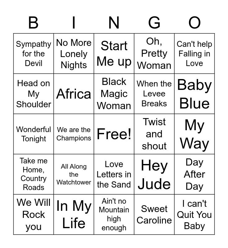 This bingo card has a free space and 42 words: Can't take my eyes off you, Black Magic Woman, Feel like Makin 'Love, All Along the Watchtower, Sweet Caroline, Day After Day, I can't Quit You Baby, The Chain, Start Me up, Love Letters in the Sand, My Way, Baby Blue, We are the Champions, Can't help Falling in Love, Come Together, Hey Jude, Every Breath you Take, Wonderful Tonight, Here comes the Sun, No More Lonely Nights, Head on My Shoulder, Another Brick in the Wall, Piano Man, Sympathy for the Devil, Baby, I love your way, California Dreamin', When the Levee Breaks, Baby, I Love you, Purple Haze, Pale Blue Eyes, Stand by Me, Take me Home, Country Roads, Africa, Ain't no Mountain high enough, Hotel California, We Will Rock you, In My Life, Twist and shout, Billie Jean, That's Amore, Oh, Pretty Woman and Escape (Piña colada Song).